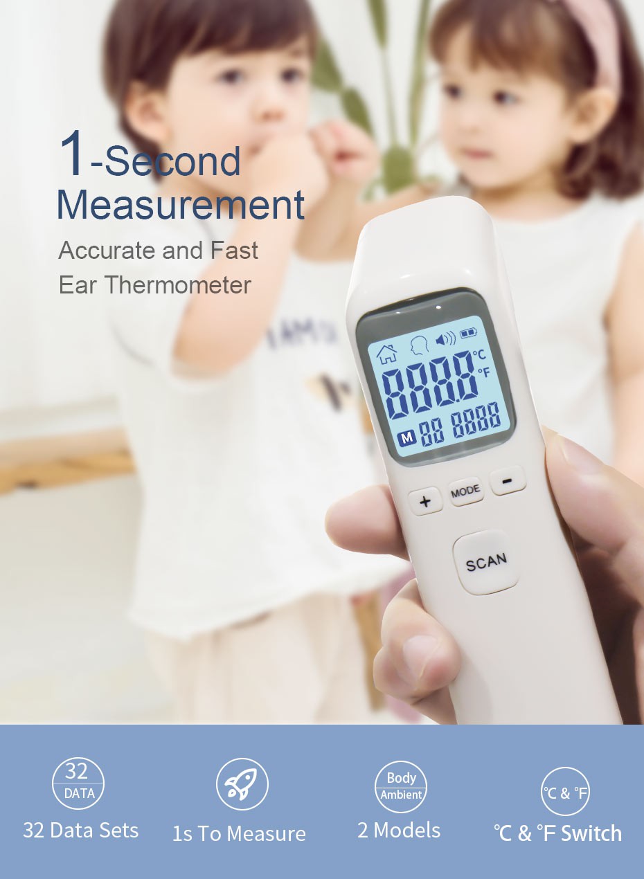 Kosketusvapaa suunnittelu Se on terveysvaikutteisempi, vähentäen mahdollisesti bakteerien tai tartuntojen leviämistä. Pidä anturi 3–5 cm: n etäisyydellä ihosta ja saat hyvän lukemisen Tarkkuuslukeminen Hyväksy edistyksellinen tekniikka, varmista, että kosketuksettoman lämpömittarin mittaukset ovat jatkuvia +/– 0,2 asteen tarkkuudella. Nopea ja helppo Se pystyy osoittamaan saat lukeman 1 sekunnissa, mikä on suuri haaste tavalliselle elohopealämpömittarille. Celsius ja Fahrenheit ovat helposti ja välittömästi vaihdettavissa kytkettävän LCD-näytön avulla. Kuumehälytys Valkoinen taustavalo tarjoaa mukavan hehkua helposti lukemiseen yöllä tai pimeässä. Äänimerkkejä annetaan, jos mitattu ruumiinlämpötila on yli kuumehälytyslämpötilan, voit säätää kuumehälytyslämpötilaa MODE-tilassa. Lisää toimintoja Sinun ei tarvitse kirjoittaa viimeistä tallennettua lämpötilaa kuumeen aikana, tässä lämpömittarissa on sisäänrakennettu muisti, joka voi Tallenna jopa 32 lukemaa milloin tahansa